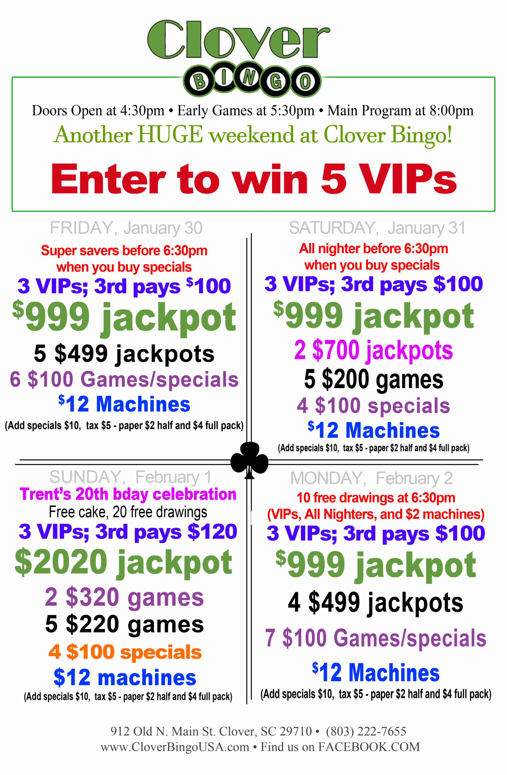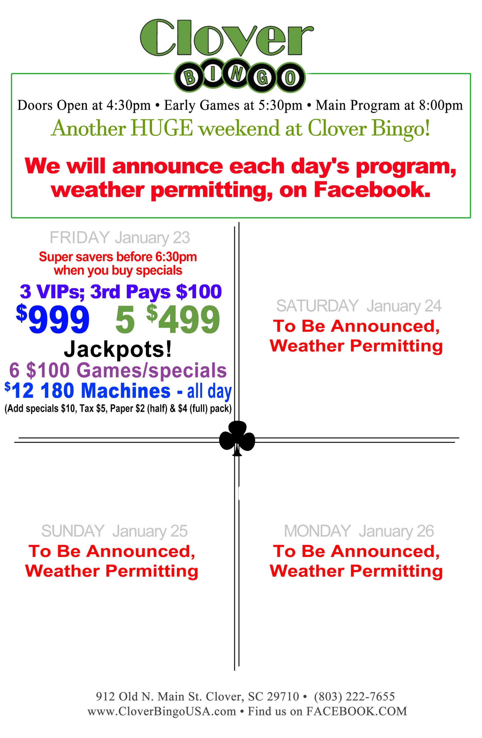 Clover Bingo is open every Friday, Saturday, Sunday, and Monday.